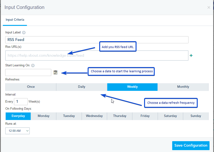 Choose the data sources your Chatbot will gather information from. Options include RSS feeds, webpage content, YouTube video transcripts, API endpoint or uploaded files. Specify the refresh rate to ensure your Chatbot's learning process stays up-to-date.