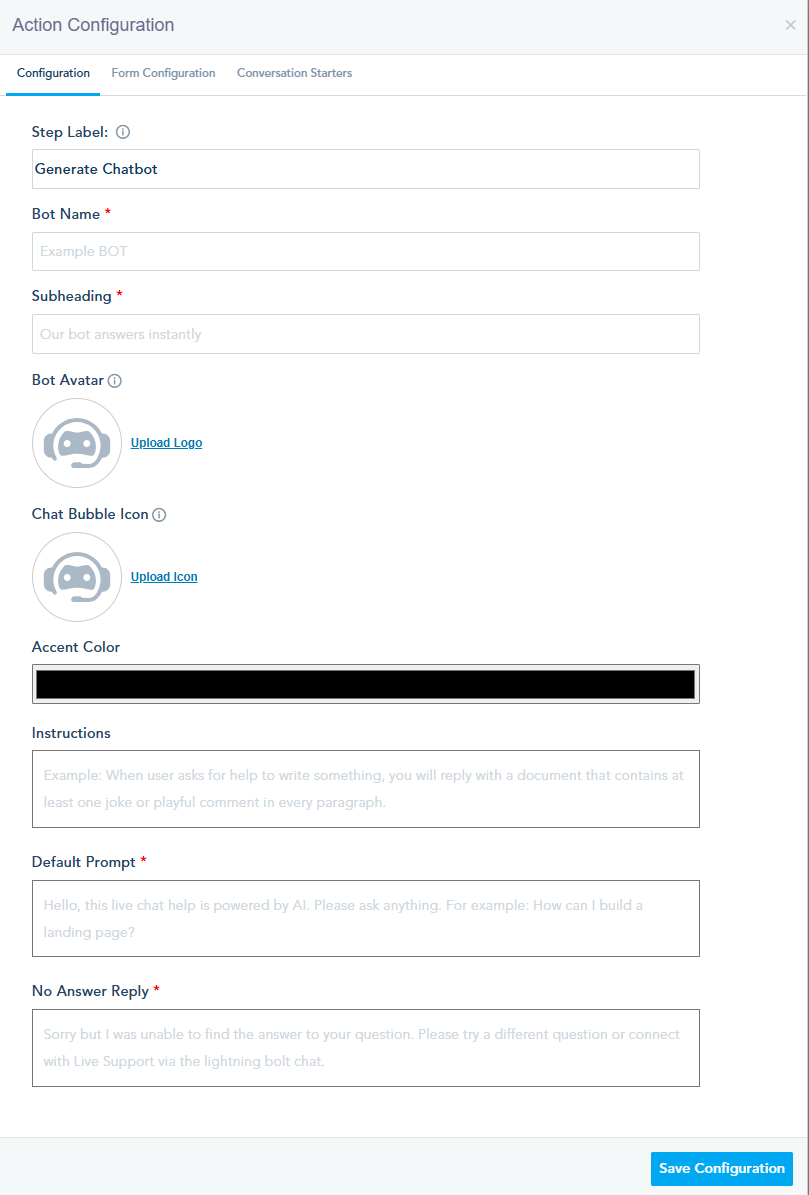 Design and configure your Chatbot's appearance and behavior. Give your bot a name, subheading, and avatar. Customize the chat bubble icon and theme color to align with your brand identity. Provide instructions for how the bot should respond to queries, set a default prompt for initiating conversations, and define responses for unanswered questions.