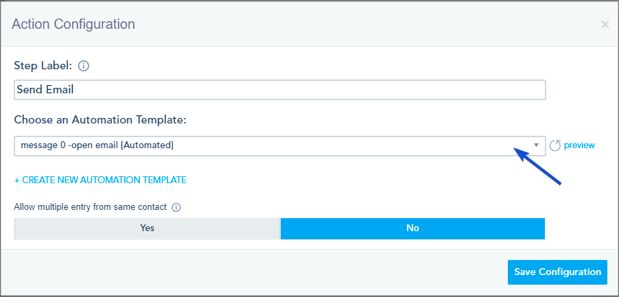 In the Action configuration, you can choose the email you want to send from the Automated Messages created.