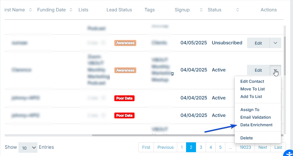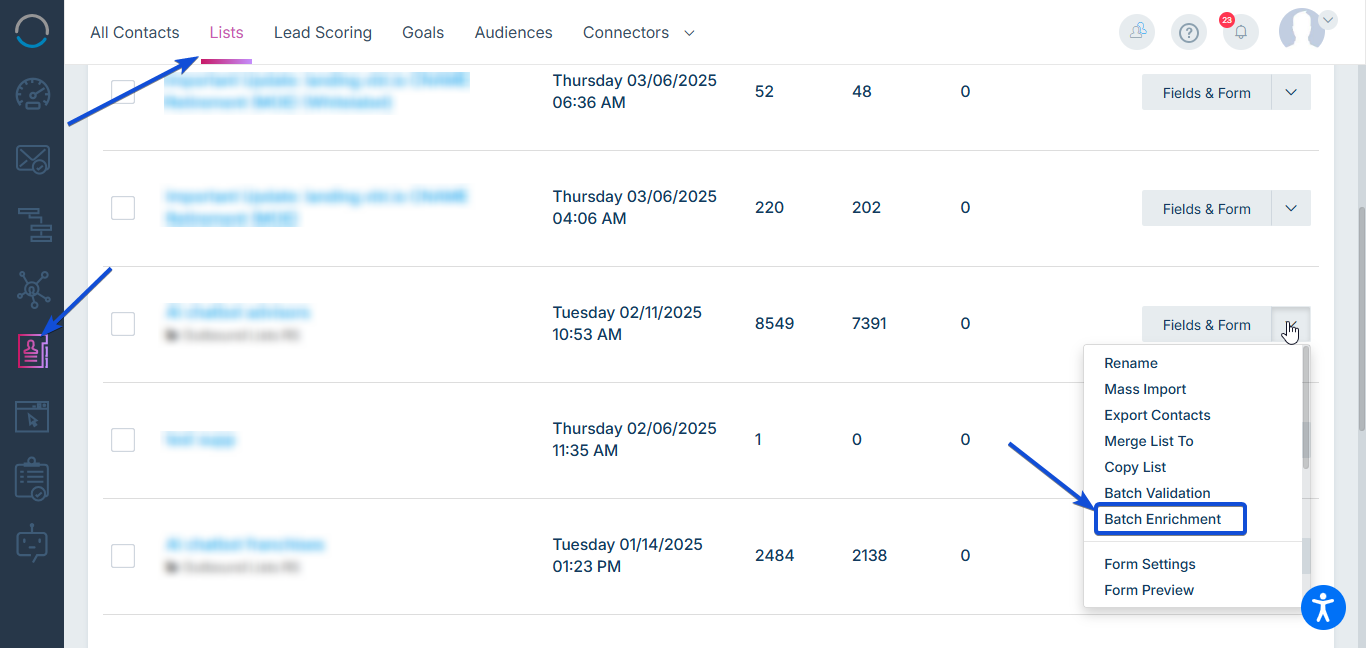 - From the dropdown menu next to your list, select Batch Enrichment.