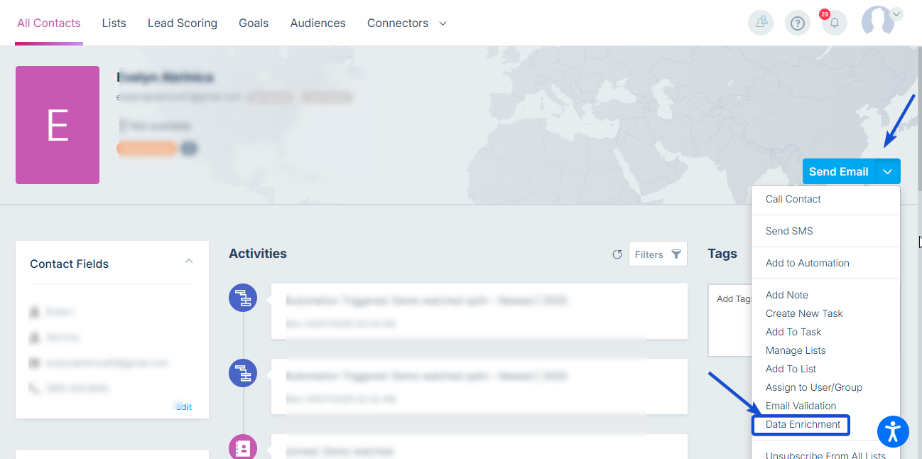 - Select Data Enrichment from the dropdown next to a contact or directly from the contact profile.