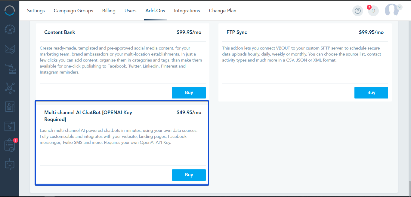 Go to the add-on section and purchase the "Multi-channel AI ChatBot [OPENAI Key Required] " Add-On. This add-on will unlock the capabilities needed to create and manage your AI-powered Chatbot.