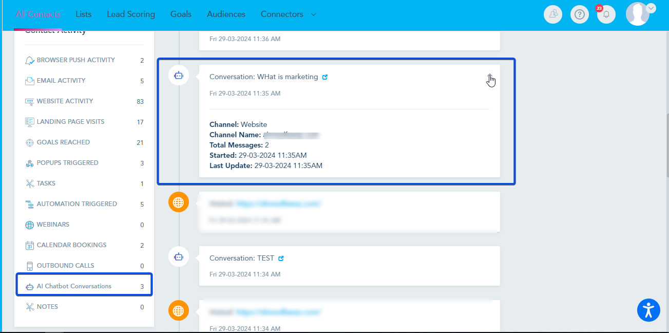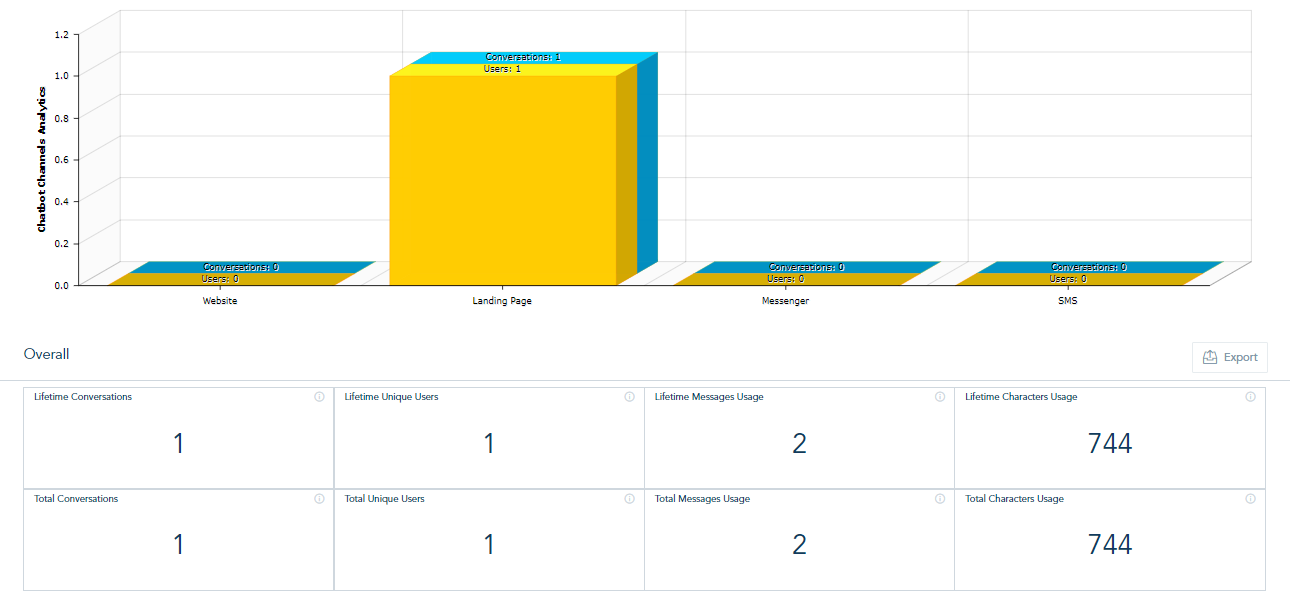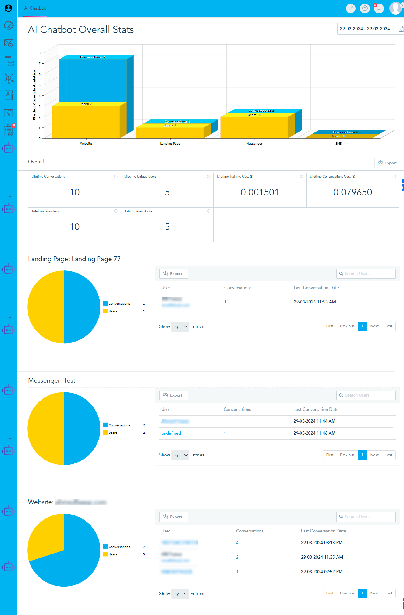 Monitor the performance of your Chatbot by accessing the Analytics section under AI Chatbot. Track metrics such as the number of conversations, unique users, and bot usage to measure engagement and effectiveness.
