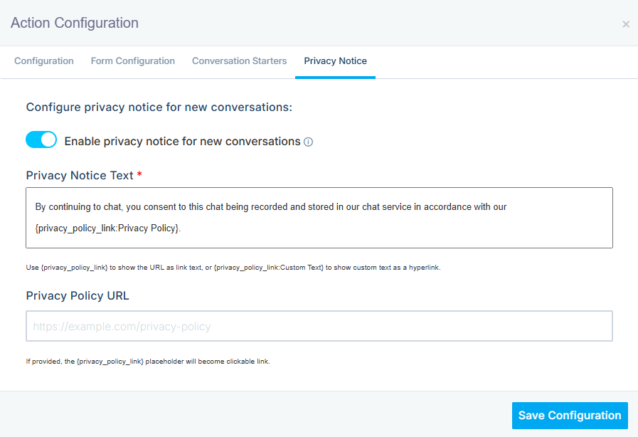 When you enable the privacy notice option, the notice will be shown at the bottom of the chat interface for new conversations.