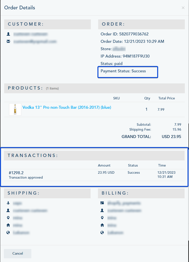 You can efficiently manage and monitor the transaction details associated with each order in Shopify directly from our platform.