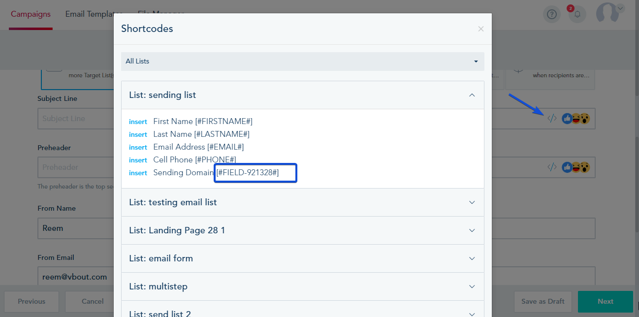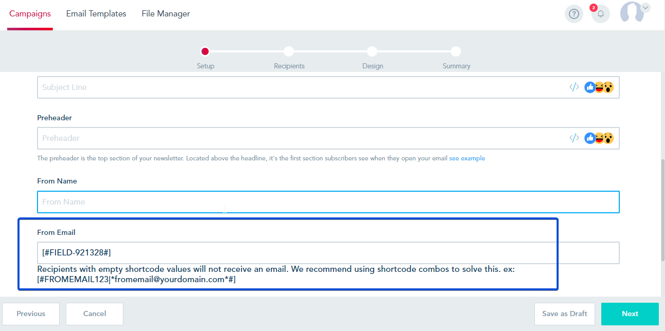 When the campaign is sent, the shortcode will be replaced by the specified From Email for each contact.