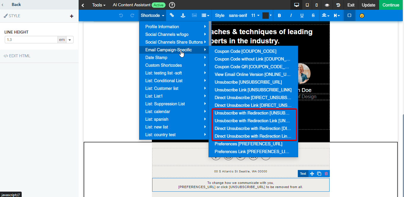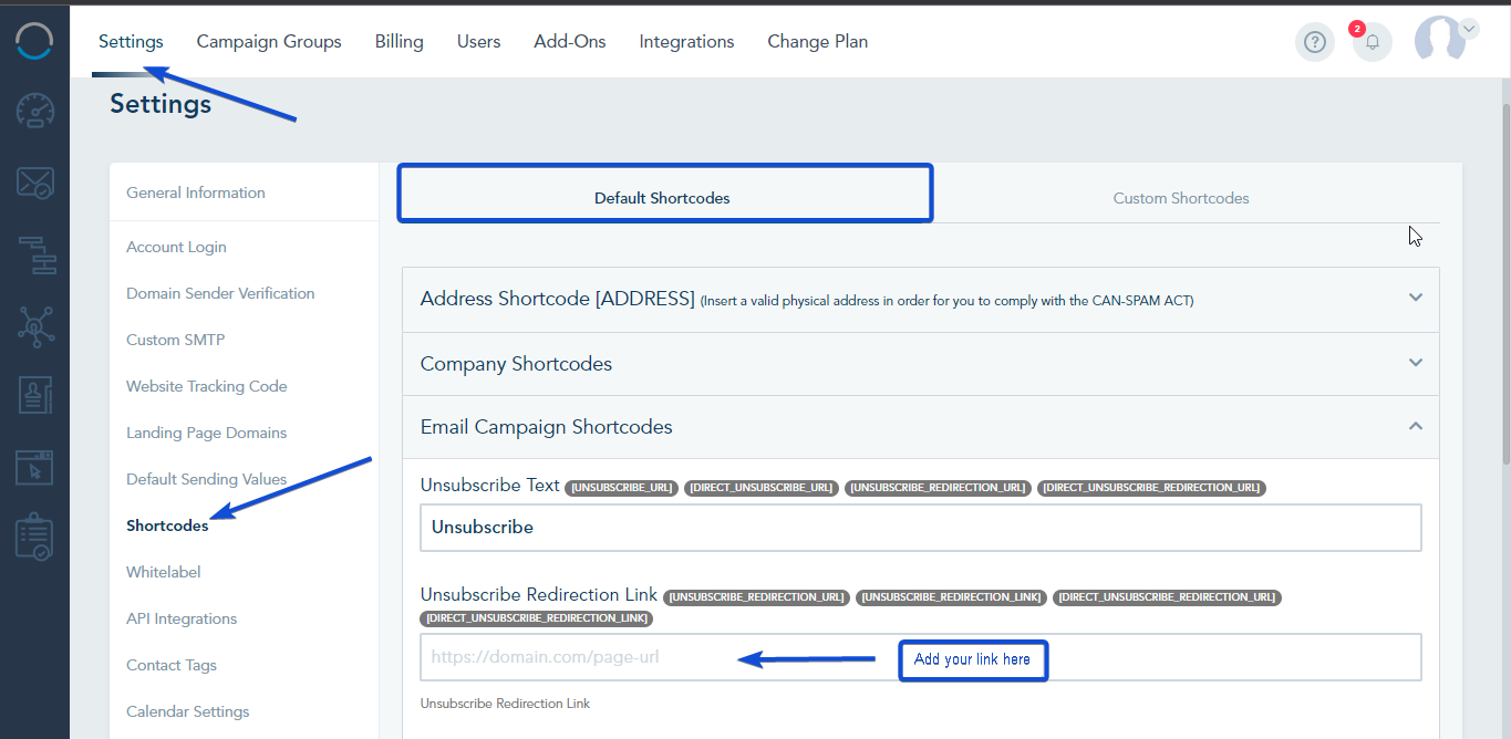 - Under the Default Shortcodes section, open the Email Campaign Shortcodes subsection.