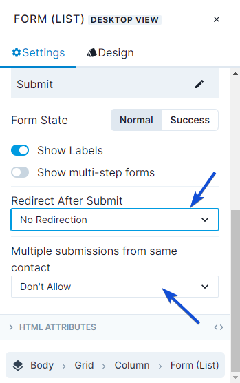 Also, you have the option to choose the settings for Multiple submissions from same contact and where to redirect after the submission.