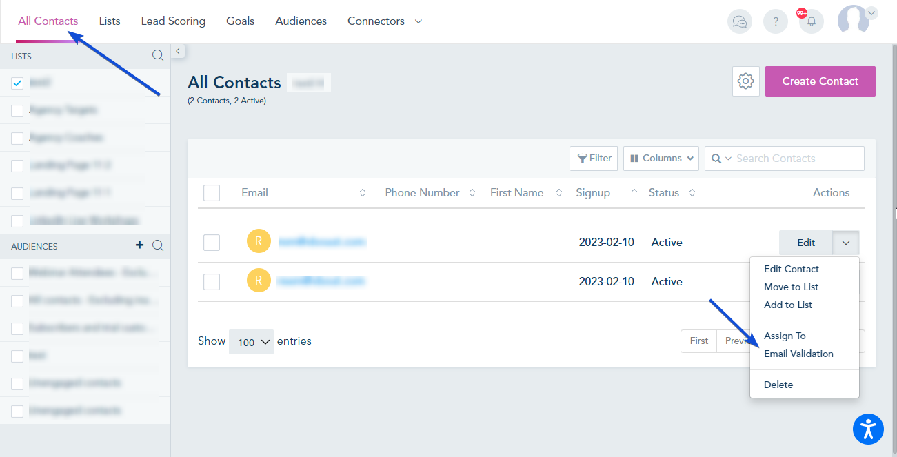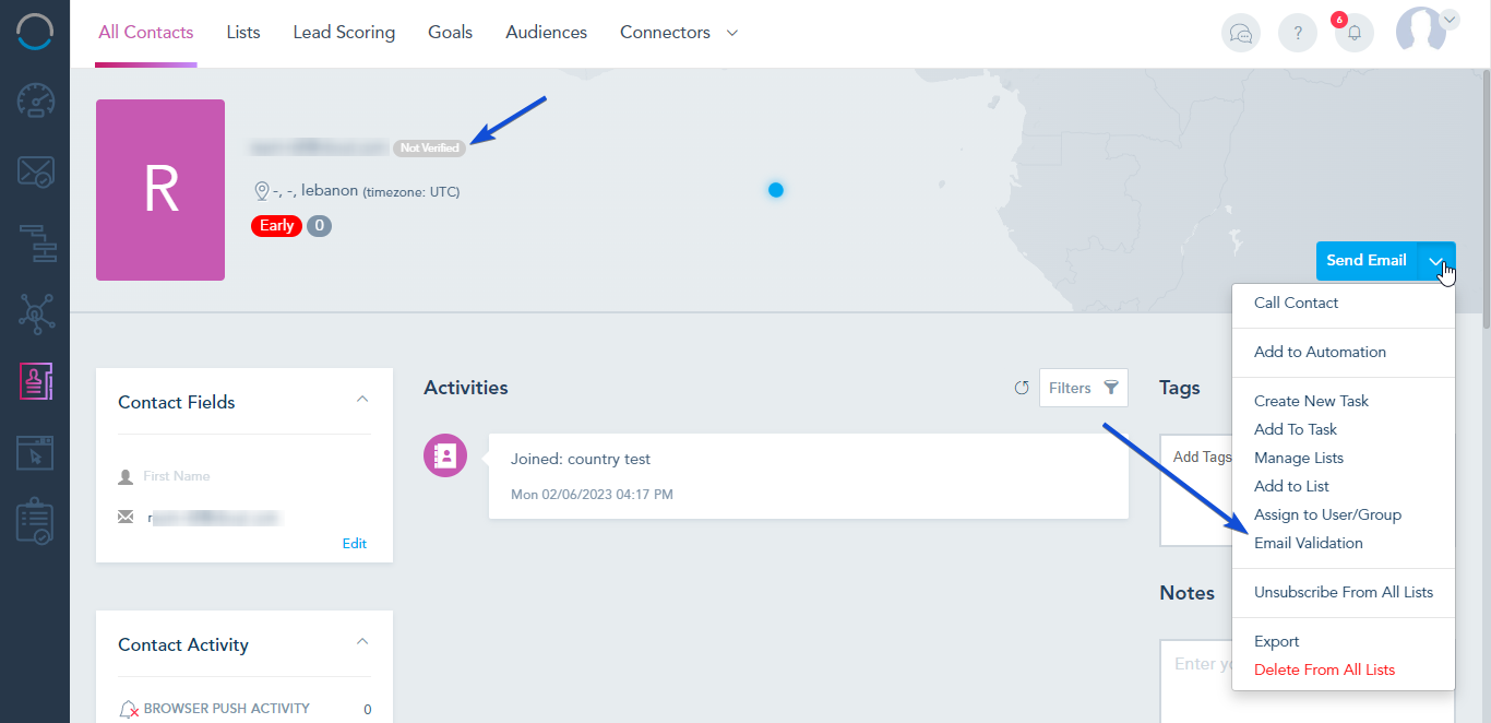 From the All Contacts page, choose Email Validation from the drop-down menu of the contact.