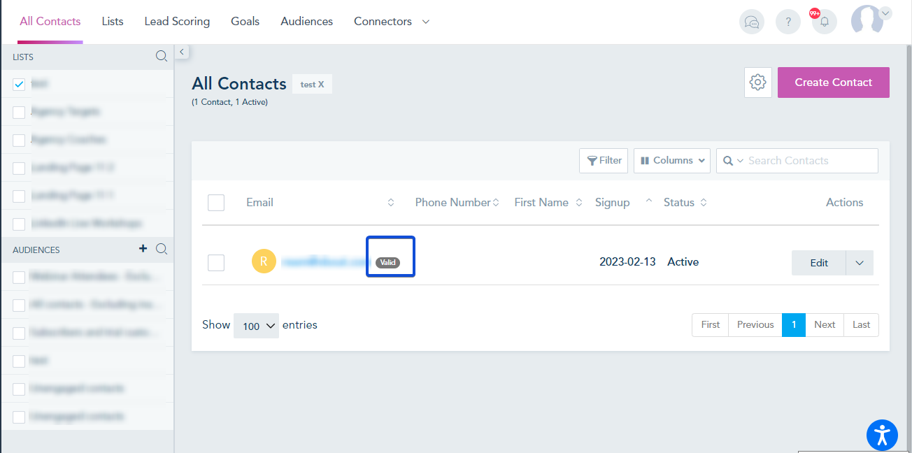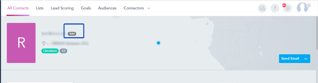 Once the validation process is completed, you can see the email status on the All Contacts page and inside the Lead profile.