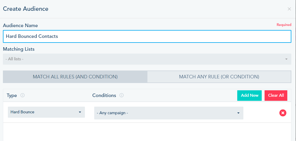 Create a new audience, give it a name, choose All lists in the Matching Lists and add the condition for Hard bounce as displayed below.