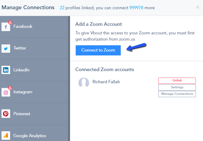 Connect your Zoom account and make sure to approve the authentication screen through Zoom.