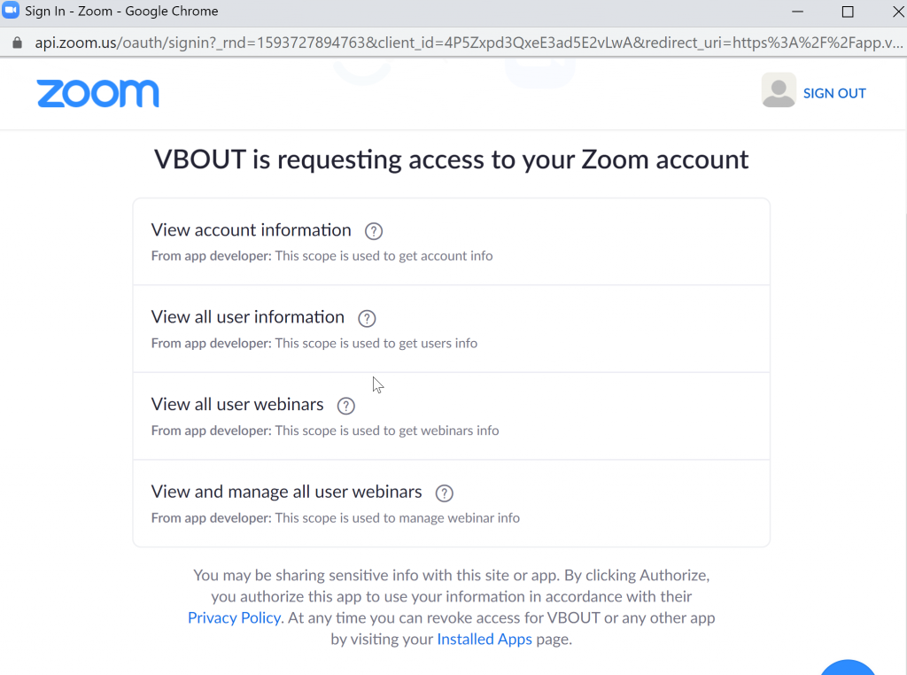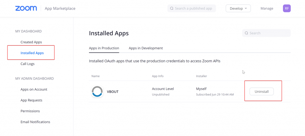 To uninstall the VBOUT Application from your Zoom account, please follow the following instructions: