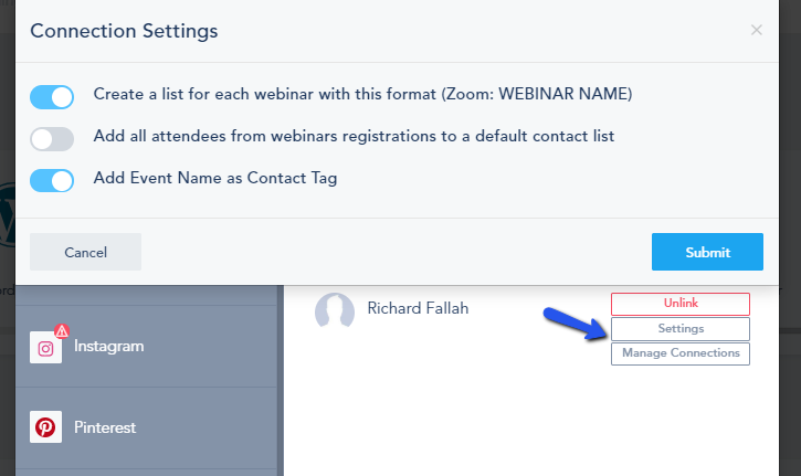 You can change the Settings once you connect the account to create a new list for the contacts or add the contacts to an existing list, and add tags to these contacts: