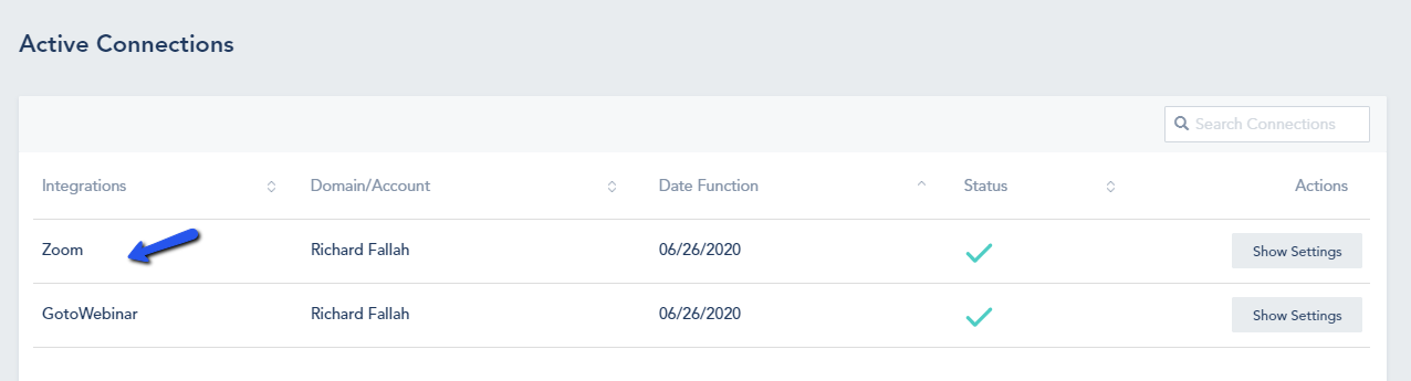 Once you successfully connect your Zoom account, you will see it under the Integrations page: