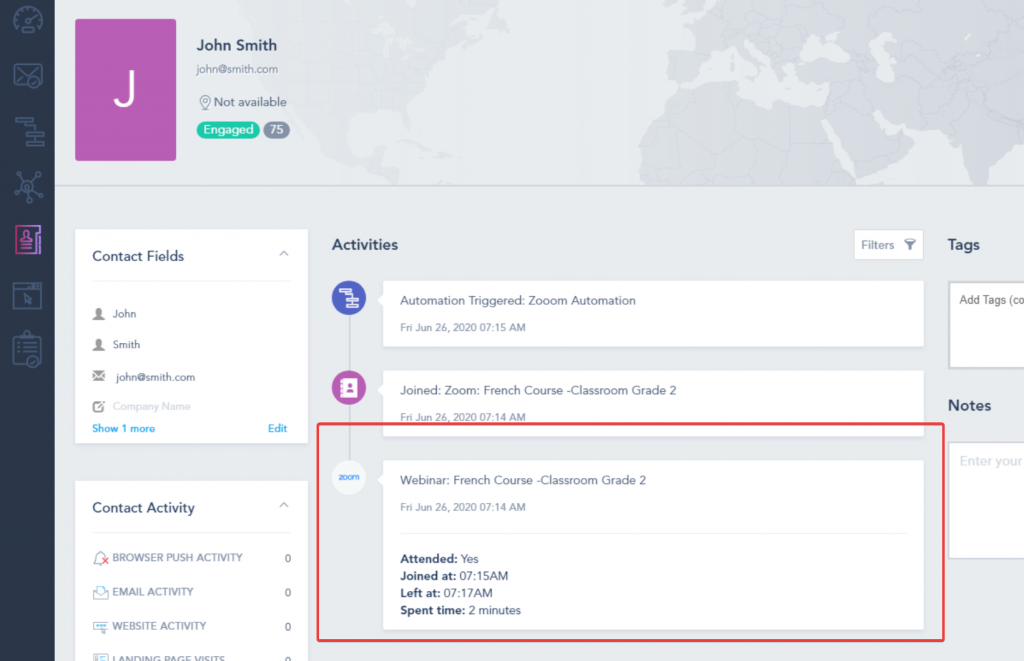 - The contact activity timeline will display the Zoom activity with the attendance time.