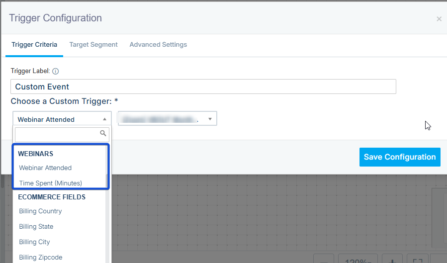 In your automation, add a Custom Event trigger. Scroll down to the Webinars section and choose a trigger.