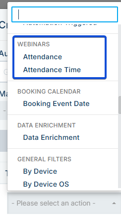 You can also use the Zoom webinar (Attendance/ Attendance Time) as a condition or filter in your Automations, Audiences, or Lead scoring.