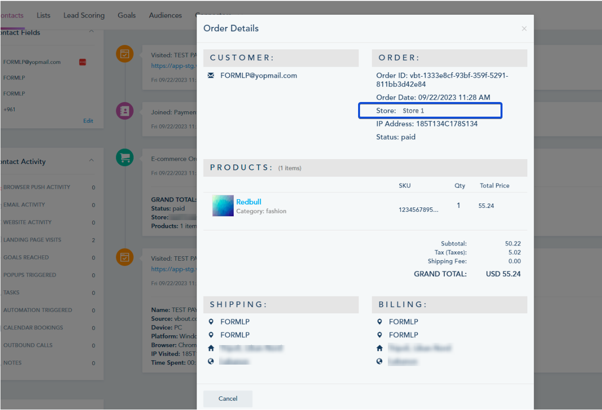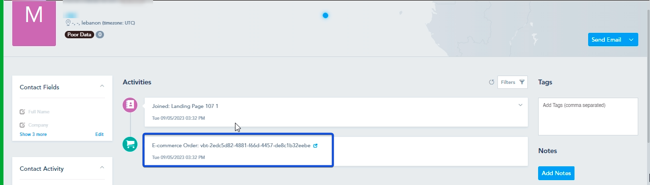 Once a contact completes a payment form, the payment will show in the lead profile as a completed order.